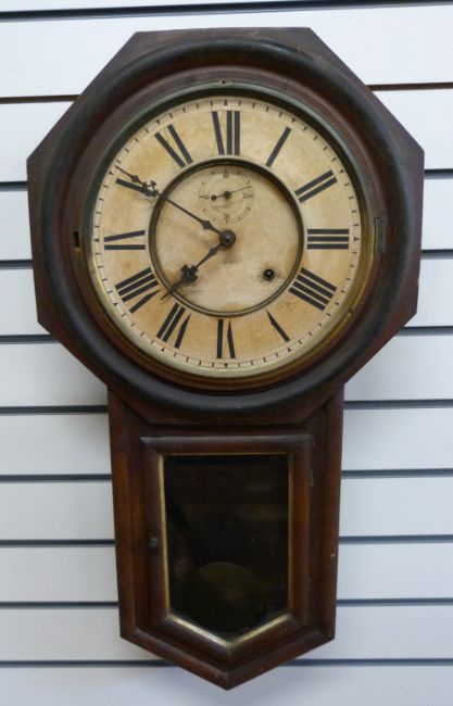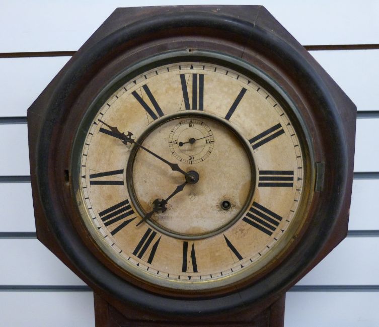 An octagonal drop dial wall clock by Ansonia New York, the Roman card dial with Arabic secondary seconds, the movement striking on a gong