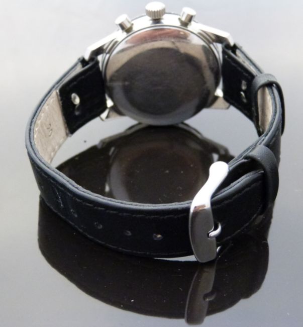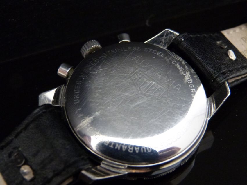 Heuer Autavia gentleman's stainless steel chronograph wristwatch with rotating black tachymeter bezel, luminous hands and baton markers, red chronograph centre seconds hand, subsidiary thirty minute and constant seconds dials, and black face on black leather strap, case diameter 40mm, circa 1970, ref 7763.