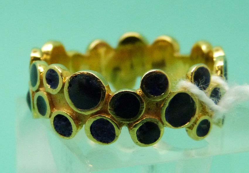 An 18ct gold ring set with circles of blue enamel (size Q), weight 5.96g