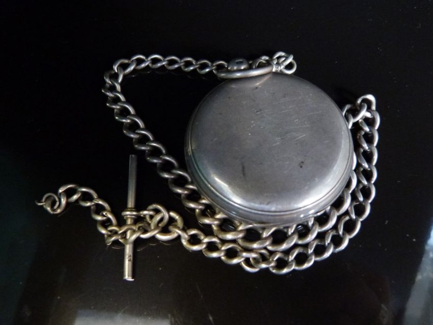 W & J Gailat of Ashton hallmarked silver gentleman's open faced pocket watch with subsidiary seconds dial, Roman numerals, gold hands and engraved and signed movement, on white metal graduated Albert, case diameter 49mm.