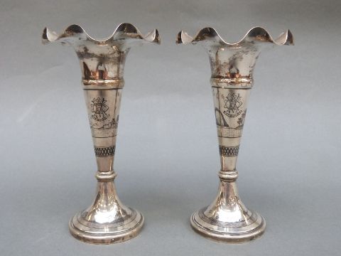A pair of white metal Niello ware trumpet or spill vases with Iraq 1936-38 and desert scene to body, height 17cm, weight 273g