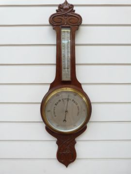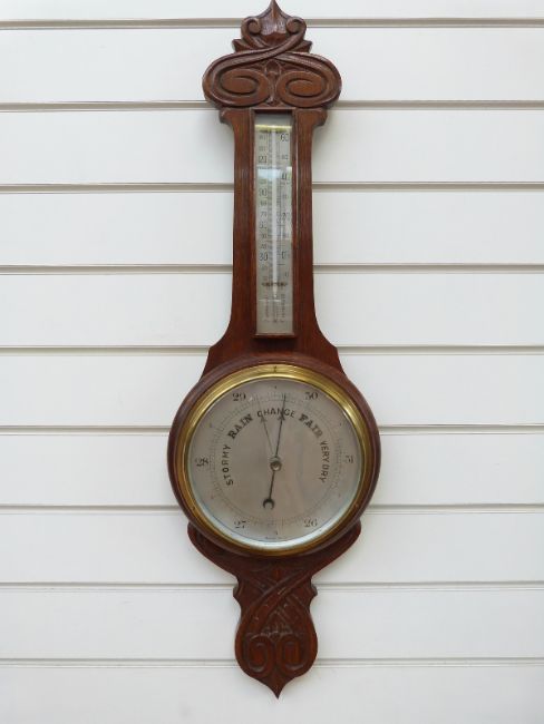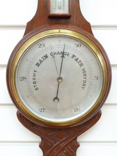 A George V period carved oak aneroid barometer and thermometer combination with silver dial, made in Great Britain, bevelled glass and brass bezel surround, 20cm dial diameter