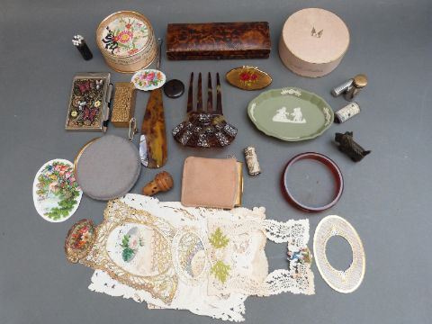 A quantity of collectables including mascot compact, Victorian scraps, pins, bangle etc