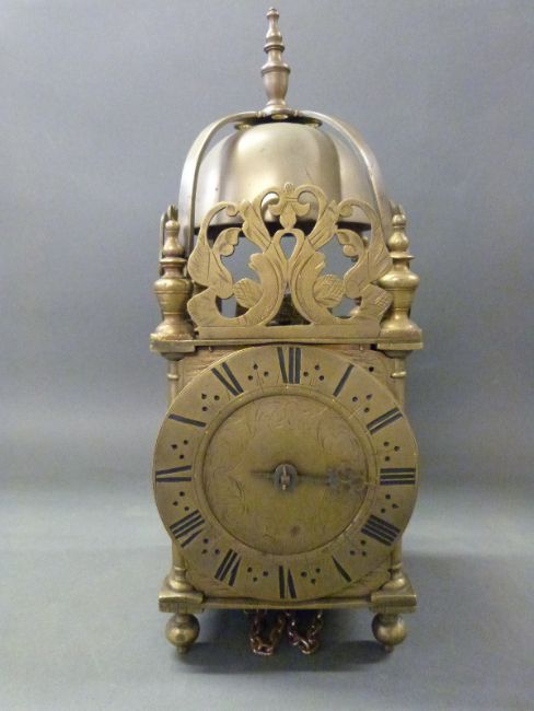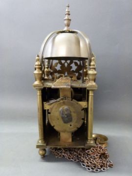A 17th century style unsigned English lantern clock with hour striking movement, crown wheel escapement and single finger hand to chased brass Roman dial