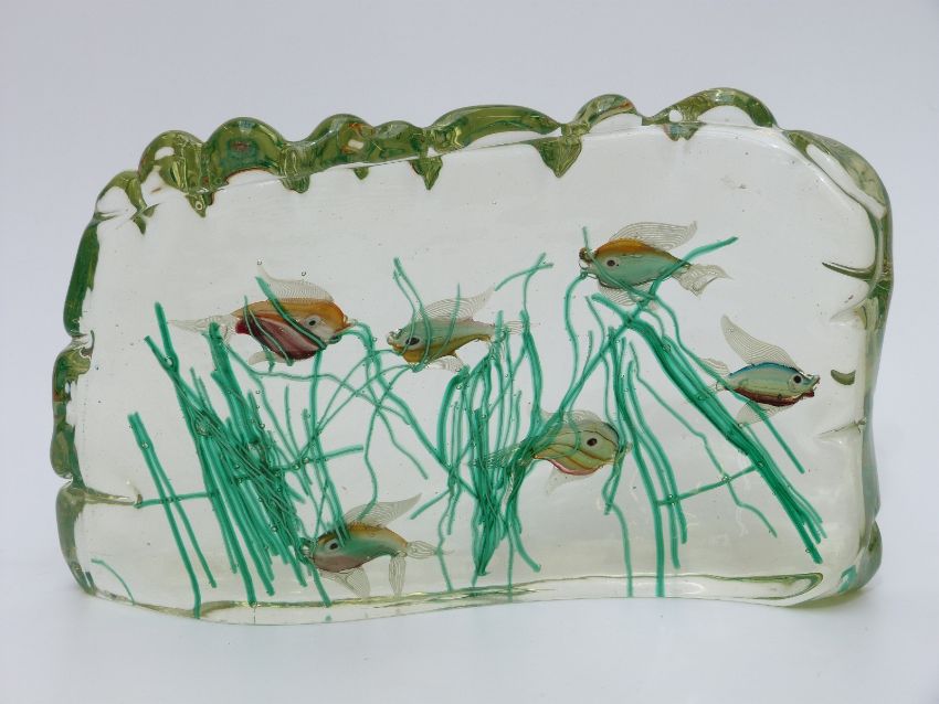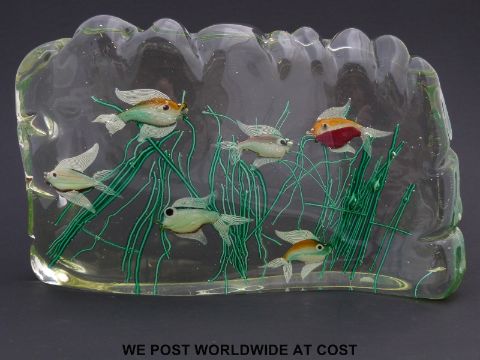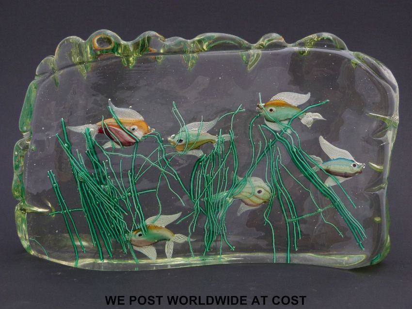 Gino Cenedese, Murano glass aquarium block of serpentine form internally decorated with six tropical fish among seaweed, 29 cm x 17 cm