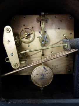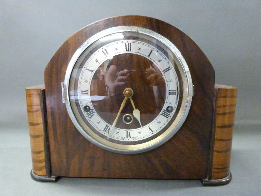 A c1930 three train English mantel clock with Roman chapter ring on utility dial, 'Chime silent' Westminster chimes & steel spade hands, in Deco style case