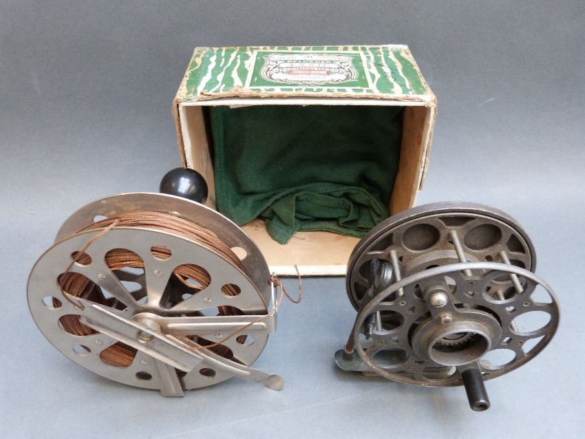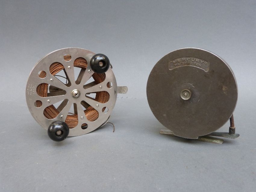 Mercury centrepin fishing reel and a Pfleuger Taxie single action example in original box