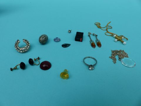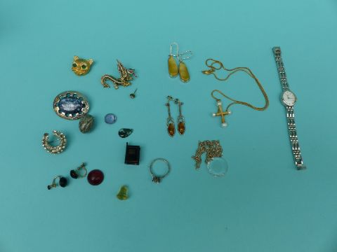 An earring set with a diamond, paste brooch, silver earrings, silver ring, silver Rotary watch, silver chain, brooches etc