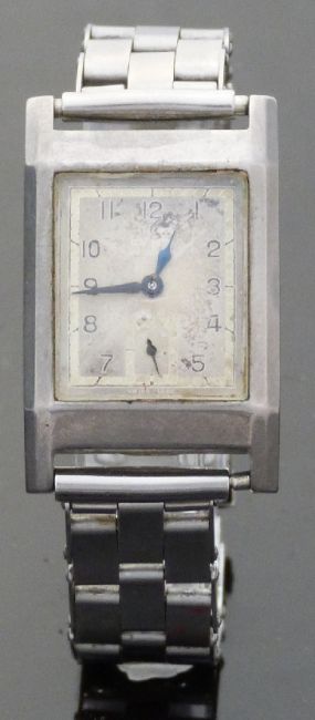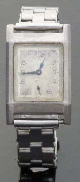 Cyma gentleman's stainless steel wristwatch with subsidiary seconds dial, blued hands, two-tone face and Arabic numerals, on expanding metal bracelet, case size 25x32mm.