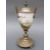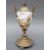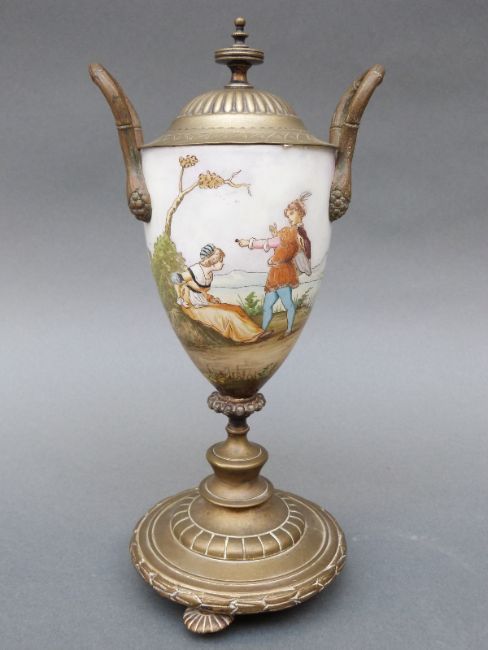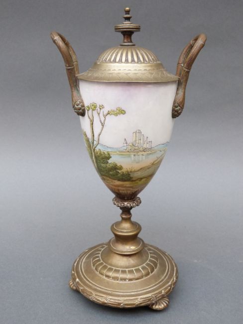 A 19thC brass mounted lidded continental porcelain goblet decorated with a romantic scene beside a lake and castle, 27cm tall