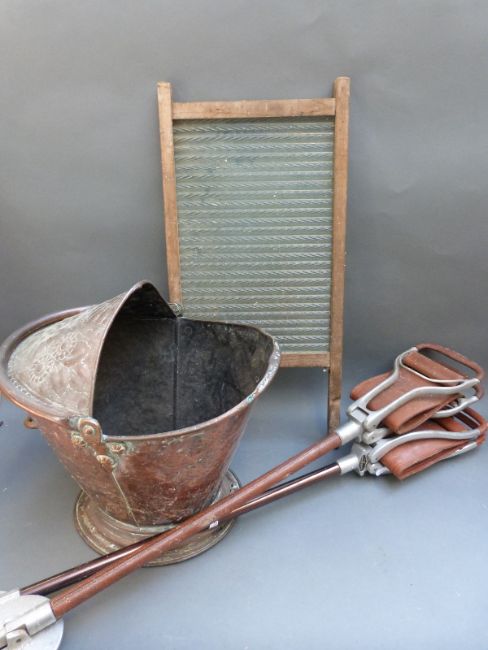 A vintage Shell 2 gallon petrol can, a copper beaten coal bucket enamelled bread bin, 19thC siliage cutter washboard and two shooting sticks