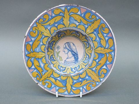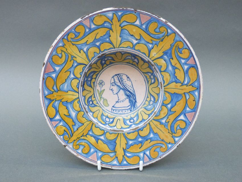 An 18thC portrait plate, possibly Cantagalli, tin glazed with blue and lustre decoration, diameter 21.5cm