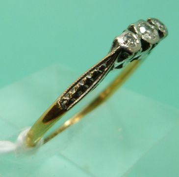 An 18ct gold ring set with three diamonds in a platinum setting (size P), weight 2.07g