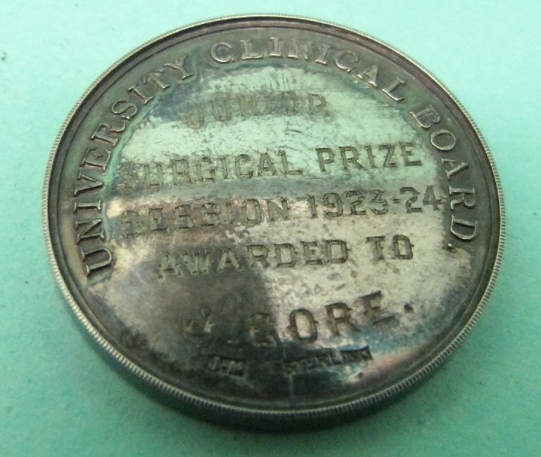 A silver medal "University of Birmingham Faculty of Medicine silver Junior Surgical Prize 1923-24, awarded to J Gore", in original box