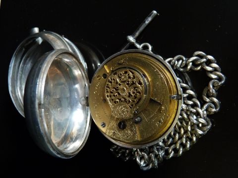 John Price of Kennington hallmarked silver pair cased fusee pocket watch with verge escapement, Roman numerals, gold hands, engraved and signed movement and pierced balance cock, on hallmarked silver double Albert, hallmarked for London, 1848, Henry Williamson, case diameter 56mm.