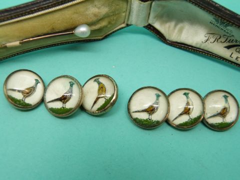 A set of six intaglio buttons with pheasant decoration and a pearl stick pin in original box
