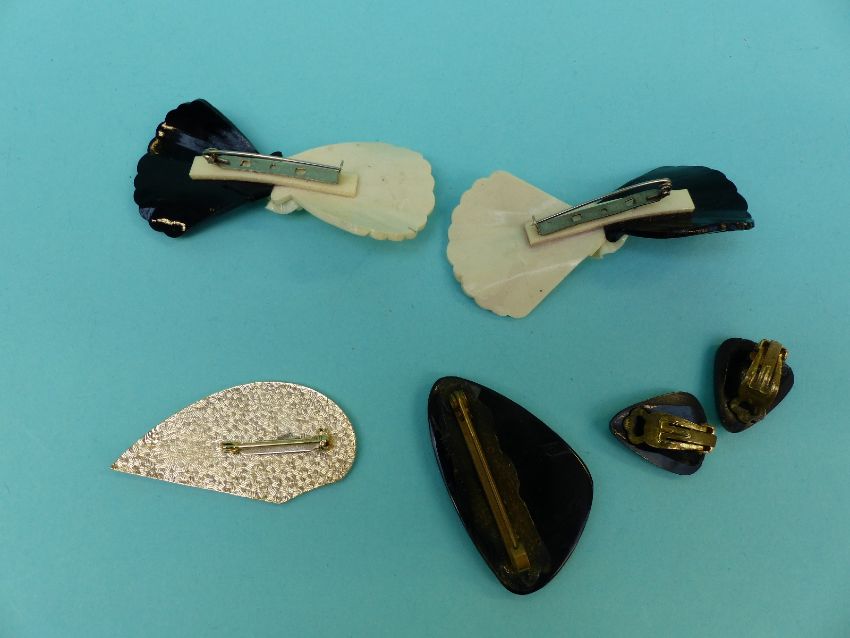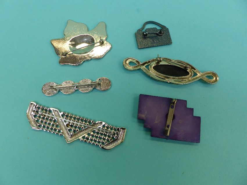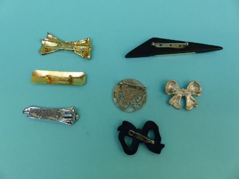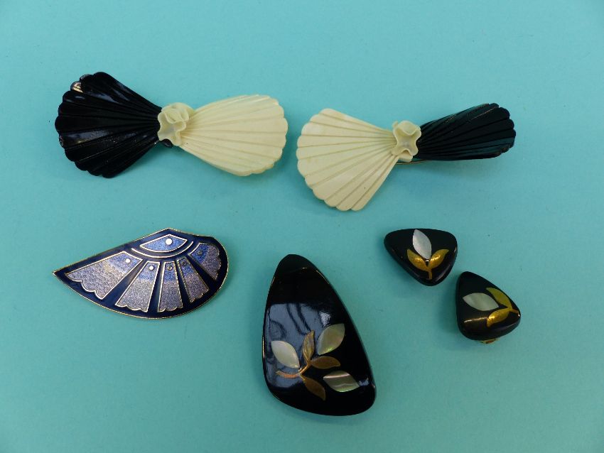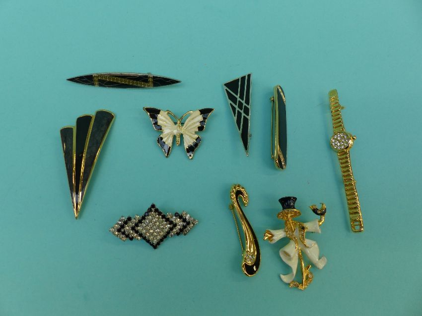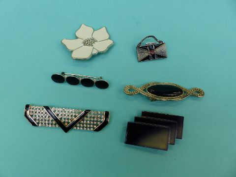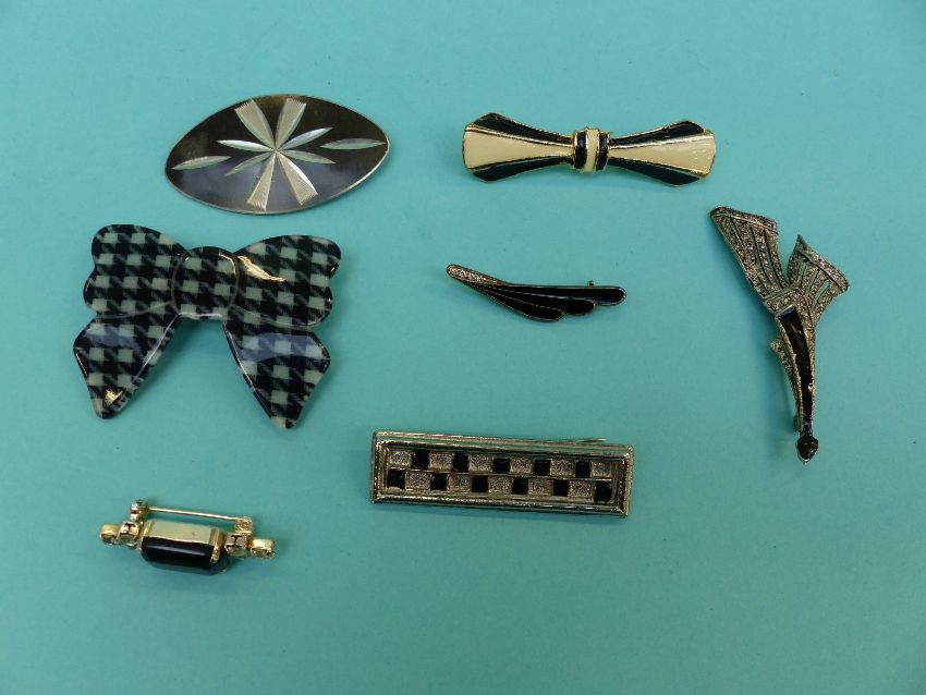 A collection of brooches including black and white examples, Art Deco hair pieces etc