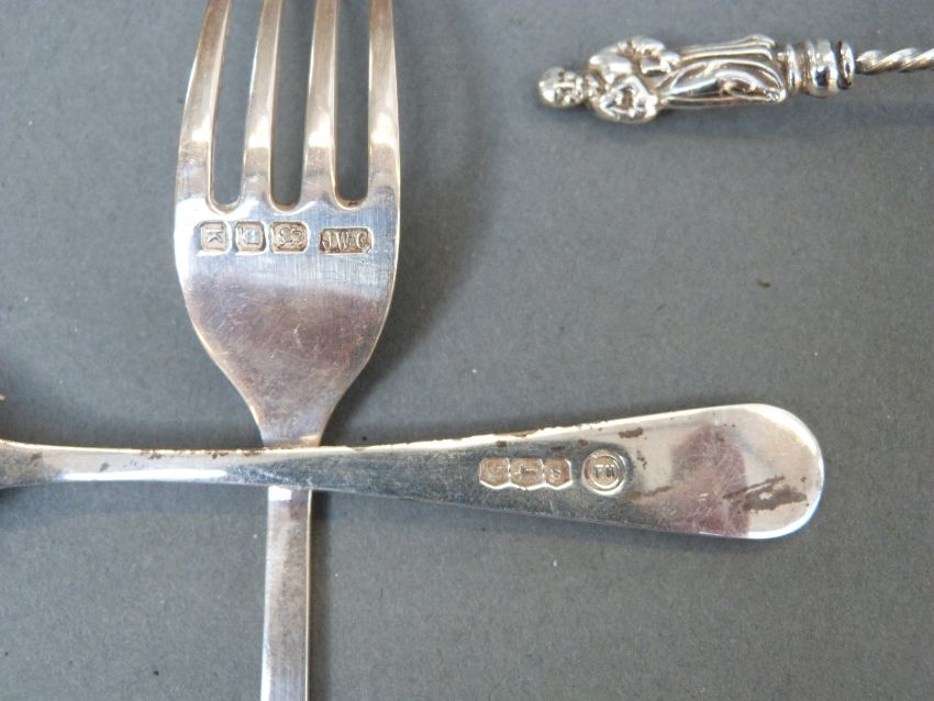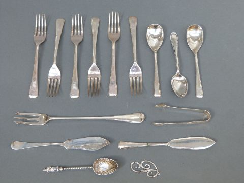 A set of six Art Deco style hallmarked silver dessert forks, London 1945 maker Josiah Williams & Co, together with quantity of further hallmarked silver cutlery including pickle fork, sugar tongs etc, weight 271g
