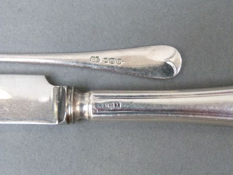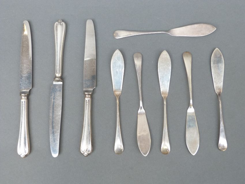 A set of six hallmarked silver butter knives, weight 88g and three hallmarked silver handled knives