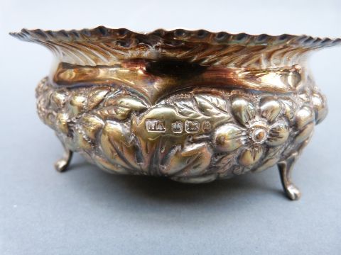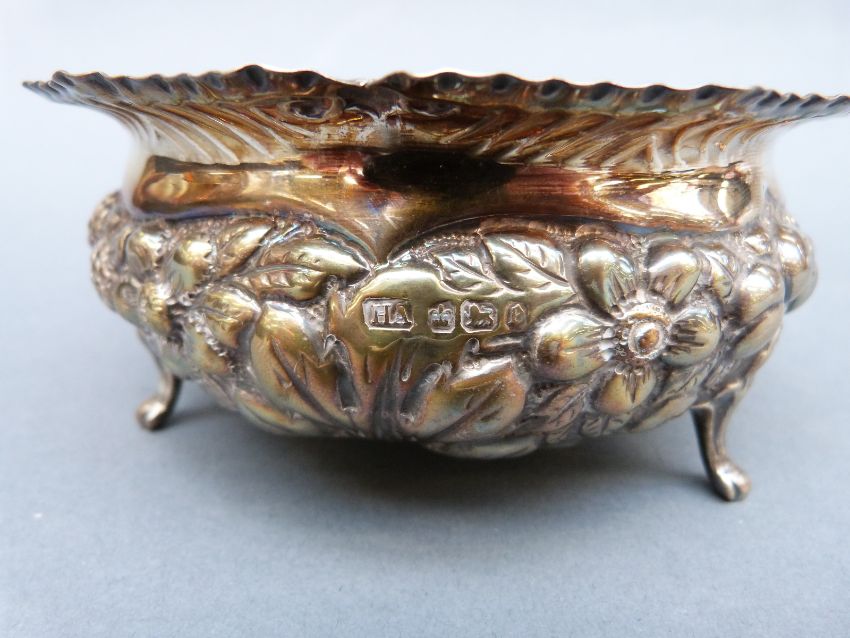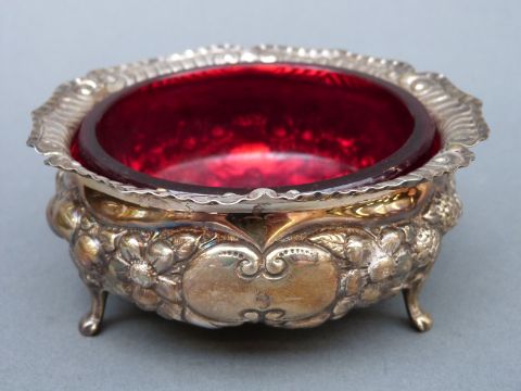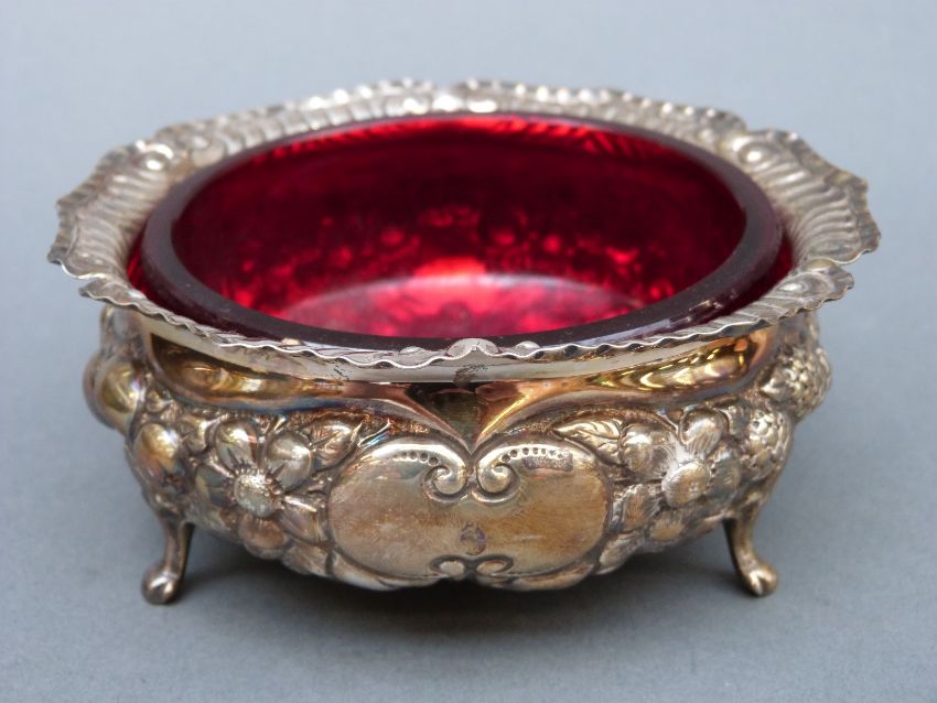 A Victorian hallmarked silver bon bon dish with ruby glass liner, the dish with ornate embossed decoration, Sheffield 1897, maker Atkin Brothers, weight of silver 145g