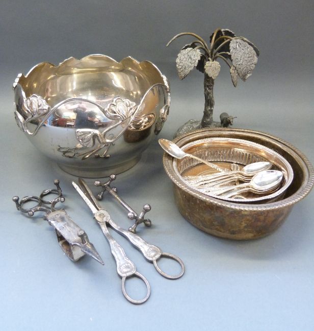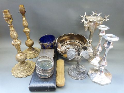 A plated figural stag centrepiece by Kenneth Turner, London; another with palm tree and oxen, brass table lamps, Art Nouveau plated bowl, pair of candlesticks etc