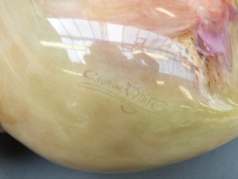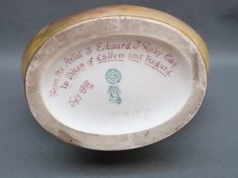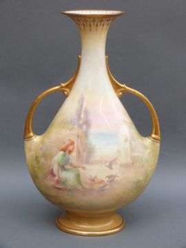 Royal Doulton twin handled vase of flattened globular form, decorated with classical scenes of a bard playing music to young ladies and a girl feeding pigeons verso by George White. Inscribed to base 'from the artist to Edward J Raby esq. in token of esteem and regard, July 1912', Edward Raby was a prominent Royal Worcester artist .37cm tall