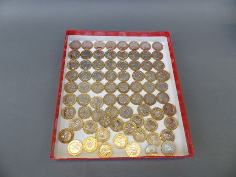 A box containing 70 £2 coins, various collectable examples including Guernsey 2006, 2012 Technology, Shakespeare including skull/tragedy, comedy/jester, Darwin etc, in near uncirculated condition