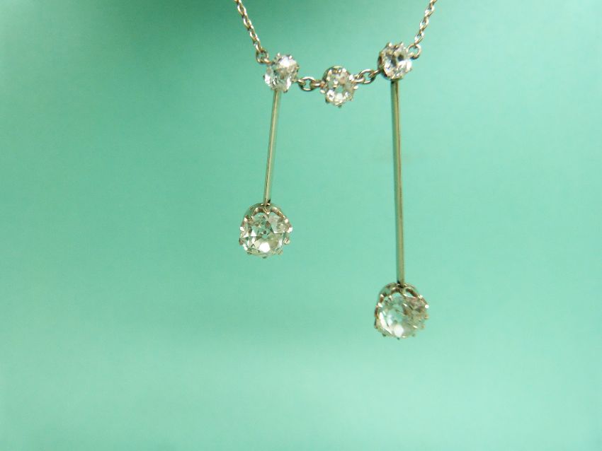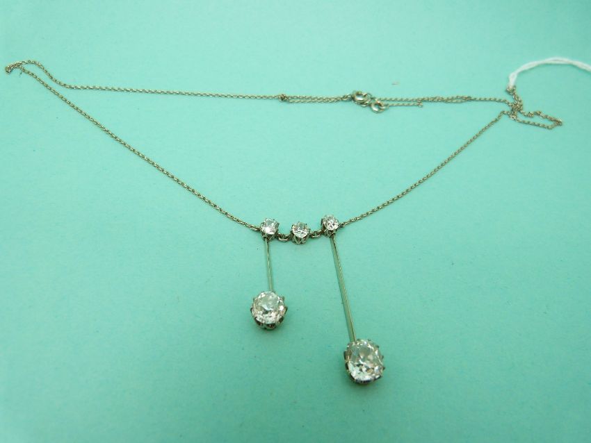 A Victorian platinum necklace set with three old English cut diamonds and two further drop diamonds measuring approximately 1.45ct and 1.2ct