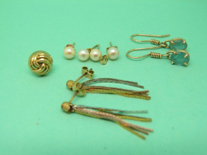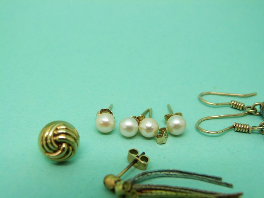 Three pairs of 9ct gold earrings, one set with blue topaz and two pairs set with pearls etc