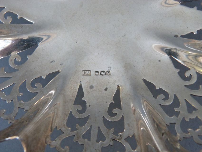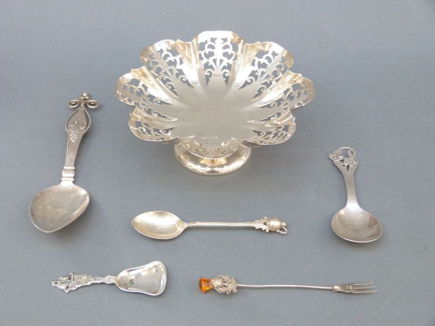 A George V Viners hallmarked silver pierced tazza or pedestal bon bon dish, Sheffield 1933, diameter 15.5cm, weight 173g, and further hallmarked silver, white metal and other cutlery including Art Nouveau