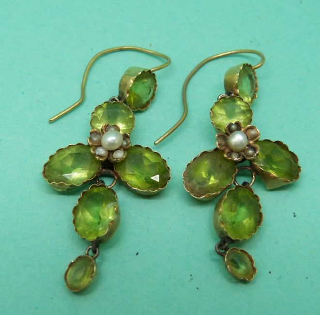 A pair of 15ct gold Edwardian earrings set with oval and round cut peridot and a pearl in a foliate design