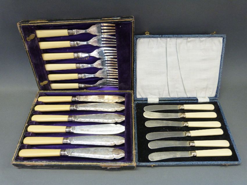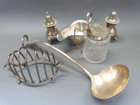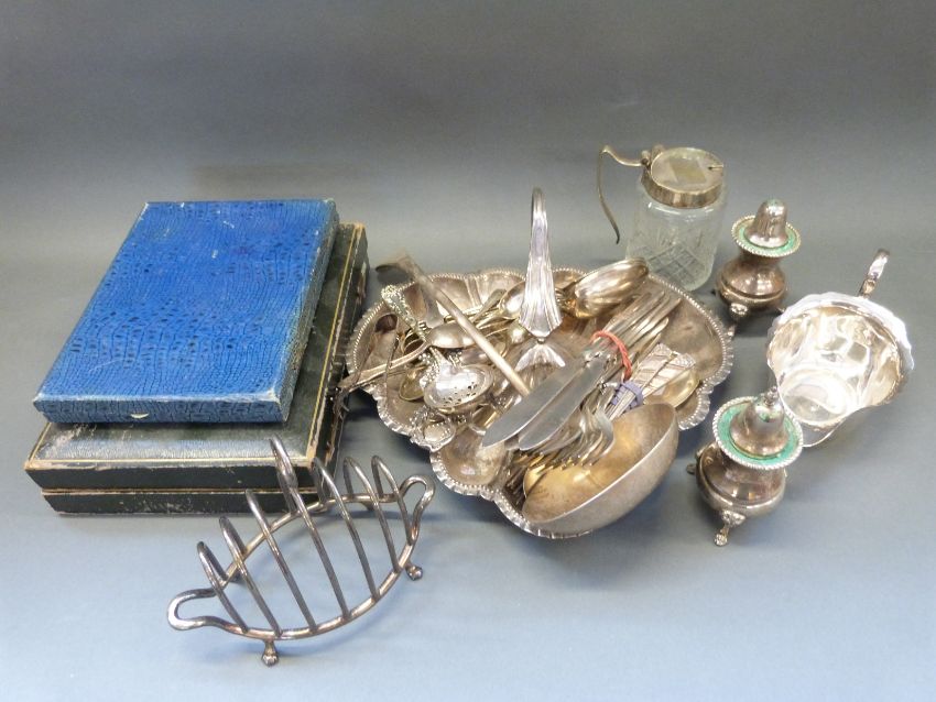 A collection of plated ware including a trefoil Walker & Hall basket, toast rack, cutlery, Norwegian caddy spoon etc