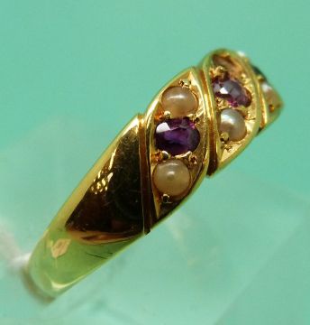An 18ct gold Victorian ring set with seed pearls and rubies (size N)