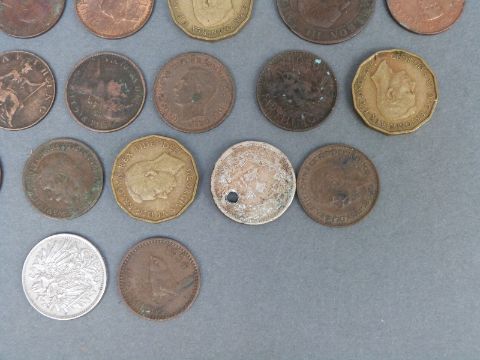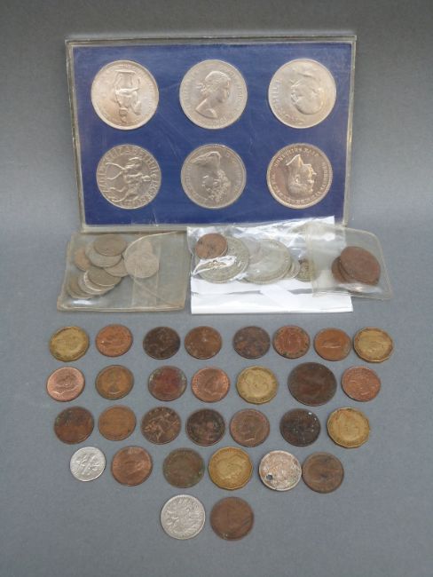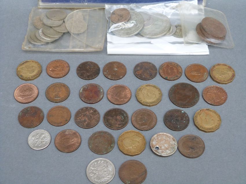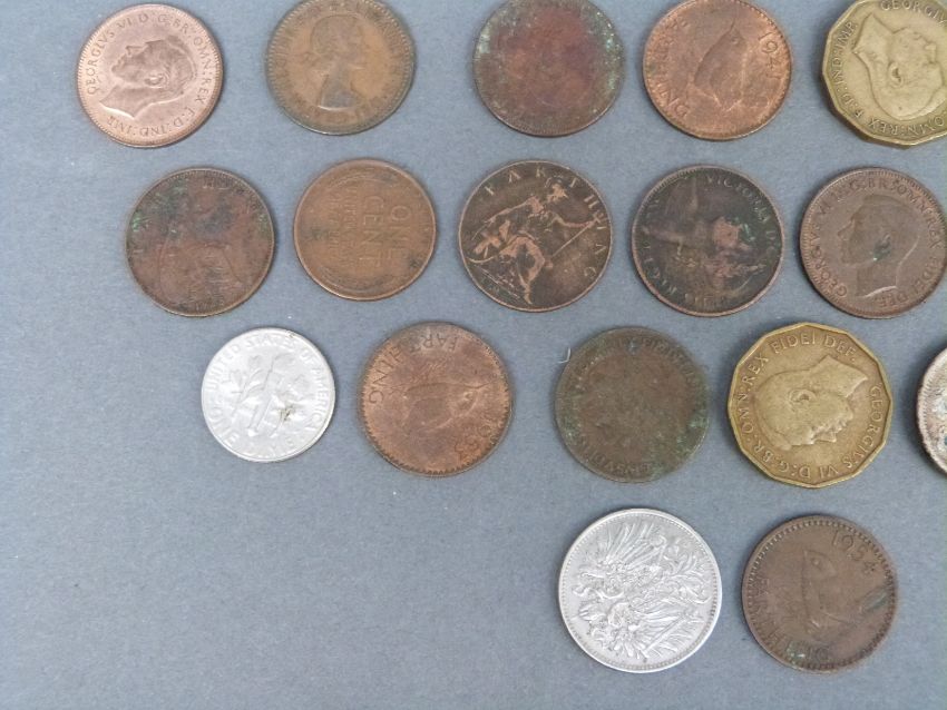 A catchet of UK and overseas coinage to include 1888 Victorian shilling, silver threepences, farthings etc, 1859 one Real, 1894, 1858 one USA cent, Australia 20 Heller, modern crowns etc