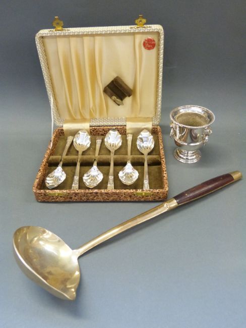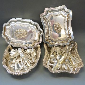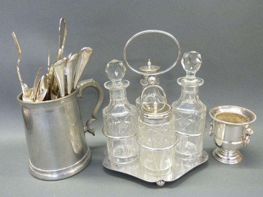 A collection of silver plated items including entree dishes, four-bottle cruet, cutlery etc