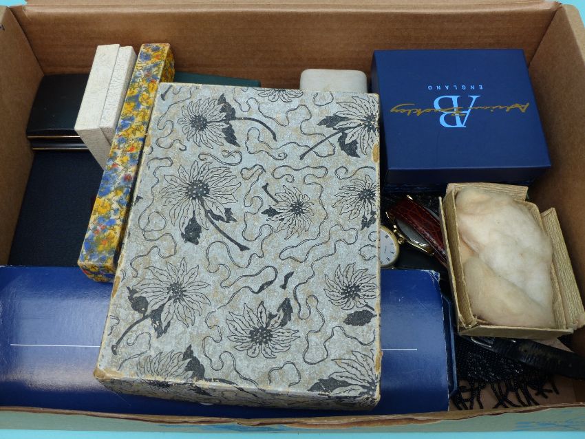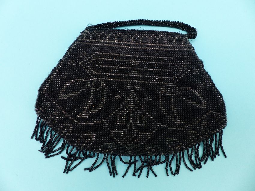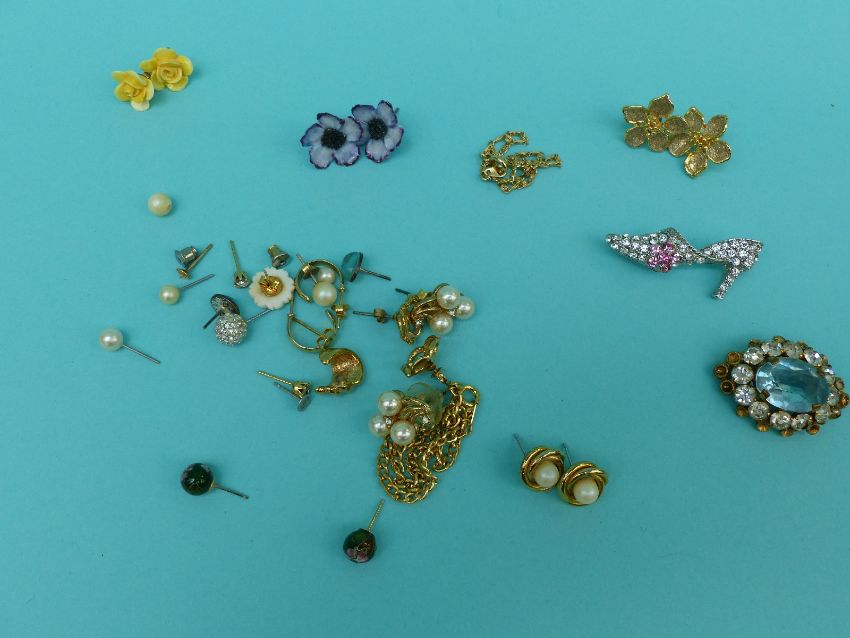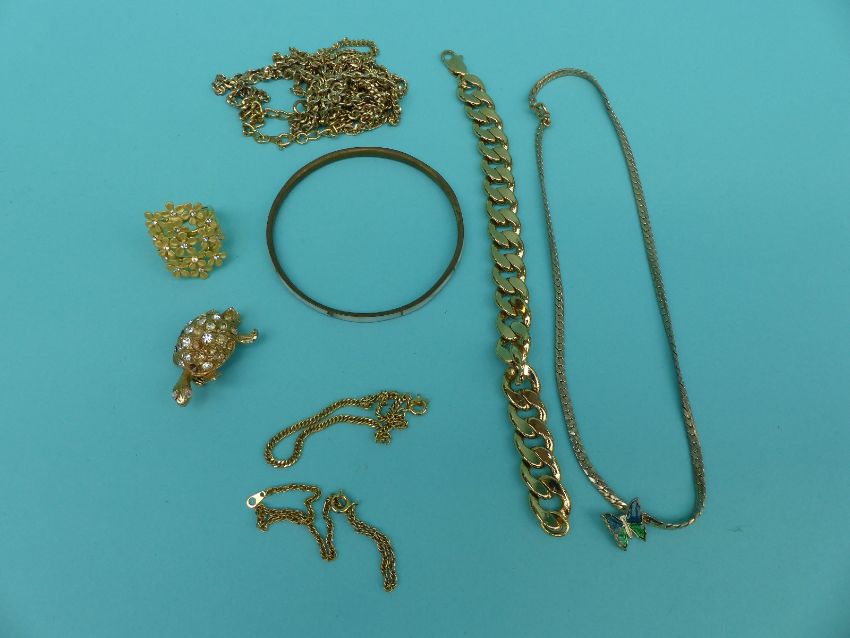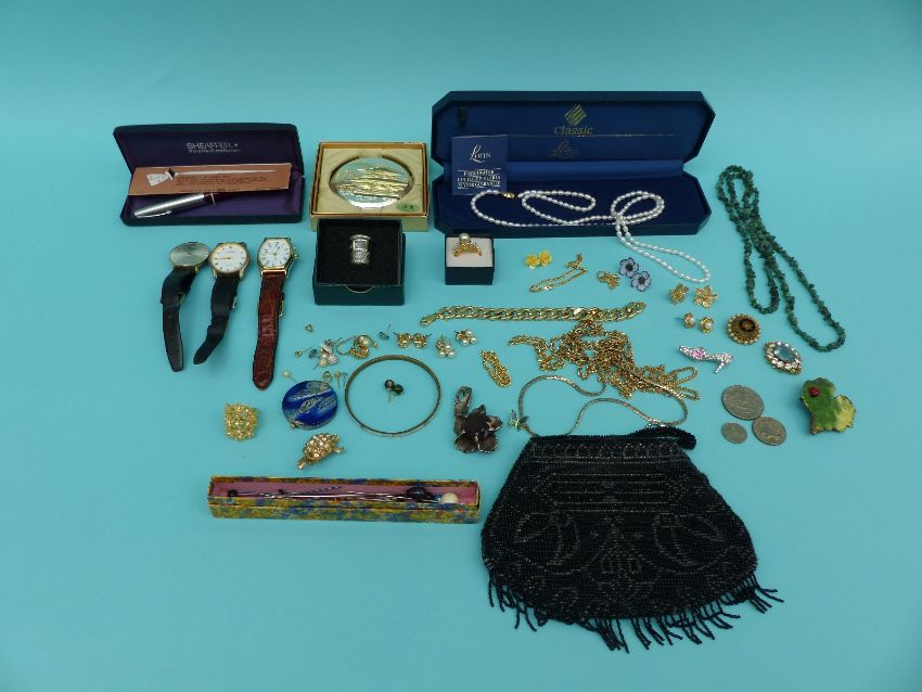 An agate necklace, plated chains, hat pins, beaded bag, watches etc
