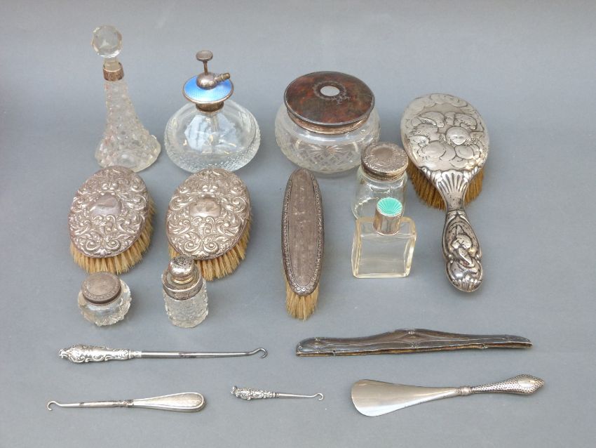 A quantity of hallmarked silver-mounted dressing table items including guilloche enamel items, brushes etc