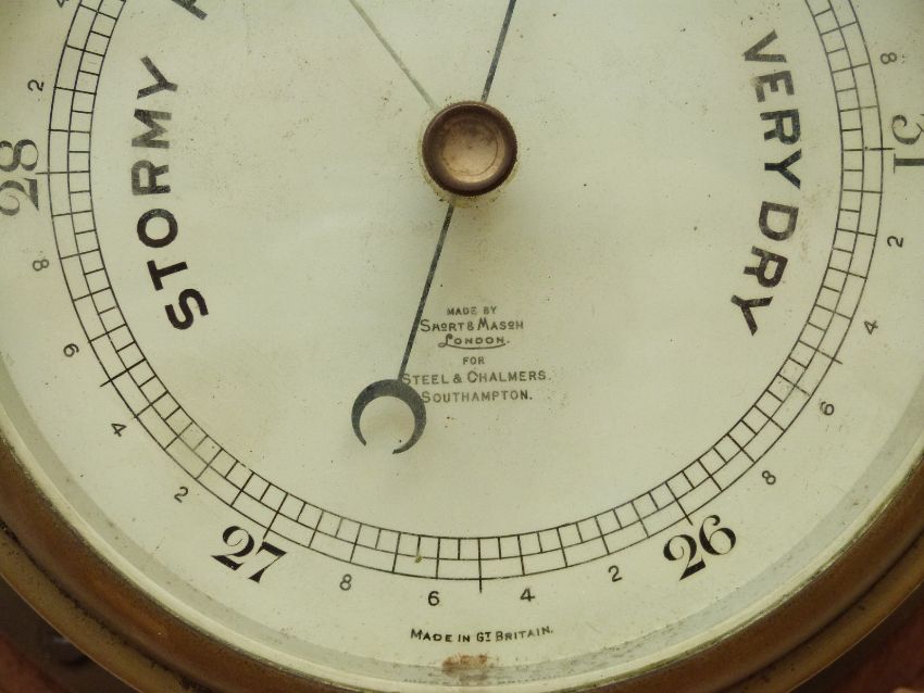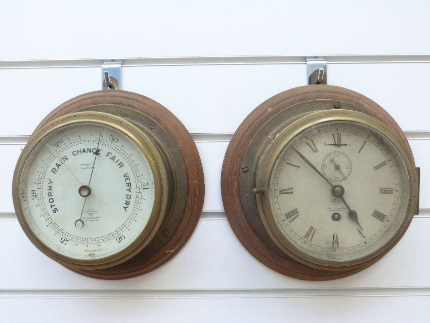 A brass cased Short & Mason ship's bulkhead clock with Roman dial and matching barometer, diameter 20cm