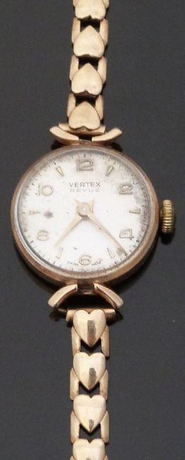 Vertex Revue 9ct gold ladies wristwatch with gold hands and Arabic numerals and silvered face, on 9ct gold heart bracelet, case diameter 21mm, 14.8g.