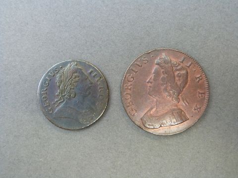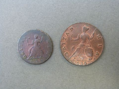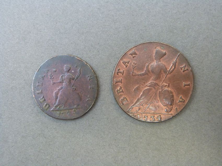 George II 1734 halfpenny with some lustre together with a 1775 farthing, George III with a little lustre and toning