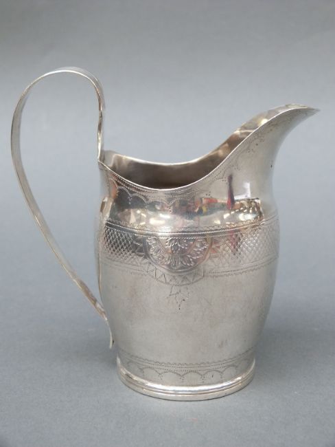 A Georgian hallmarked silver cream jug with engraved decoration marked with Georgian duty mark, lion passant and marker's mark RJ, height 11.5cm, weight 108g