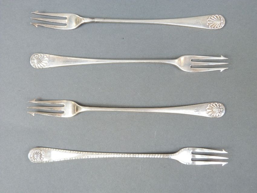 Four various Victorian shell pattern hallmarked silver long pickle forks, Sheffield 1891, 1893 and 1897, length 19cm, weight 118g