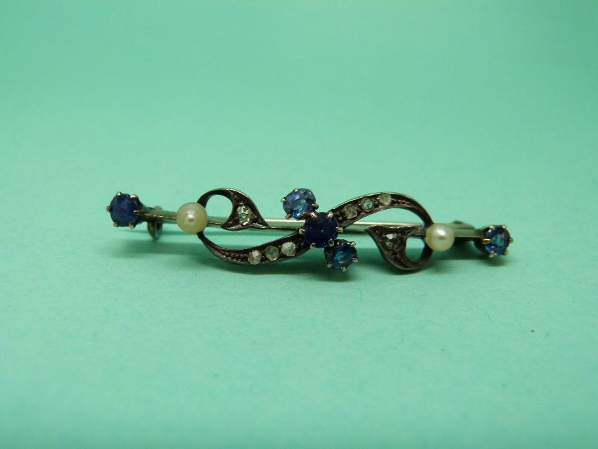 A Victorian brooch set with sapphires, diamonds and seed pearls