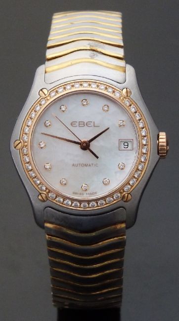 Ebel Classic ladies wristwatch with date aperture, gold hands, diamond markers and diamond set bezel, on bi-metal bracelet, case diameter 22mm.