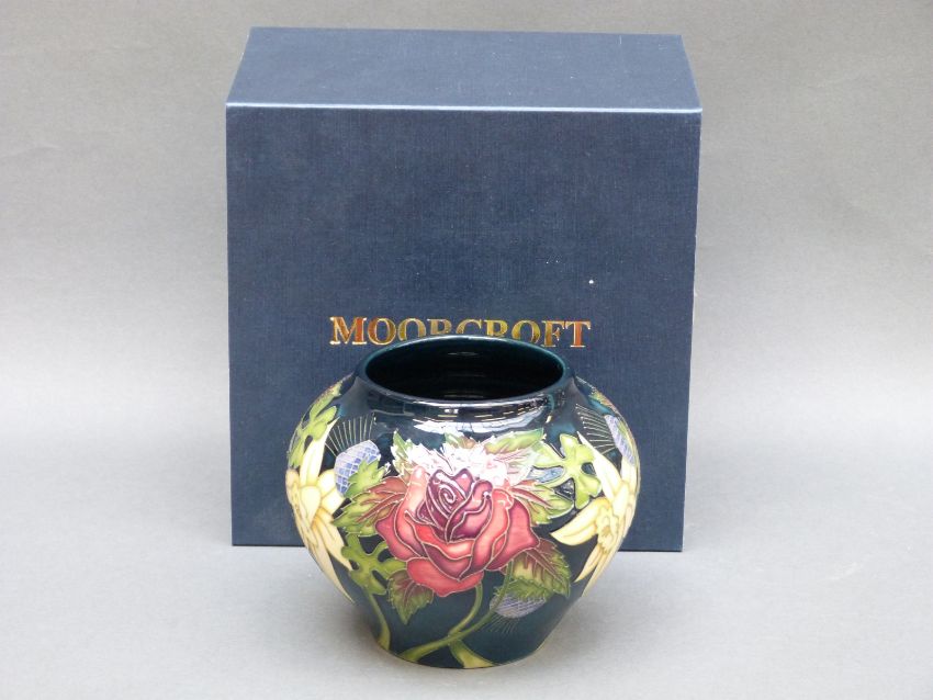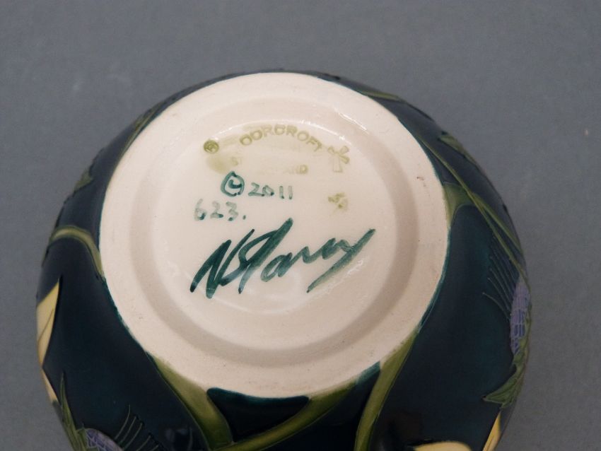 A Moorcroft vase decorated with flowers, signed by Nicola Slaney and dated 2011, 11cm tall, with box