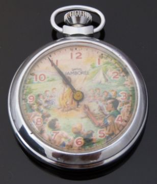 Smiths Jamboree automaton keyless winding pocket watch, the dial decorated with a scene depicting boy Scouts and Scout master with automaton arm, assembled around a camp fire in a landscape view with tents in the distance, case diameter 50mm.