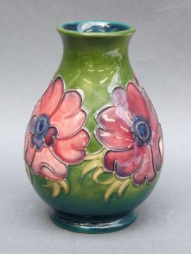 A Moorcroft vase in Anemone pattern on a green ground, 13.5cm tall