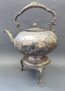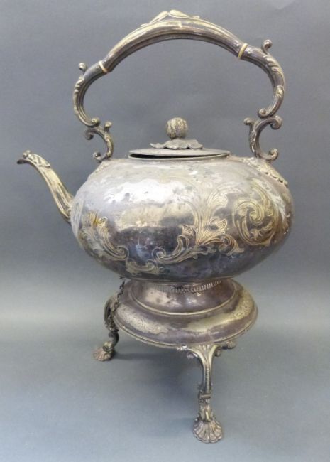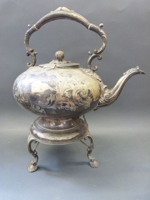Mappin & Webb plated dish and a plated spirit kettle, height 39cm, and an Art Nouveau style bowl, width 29cm