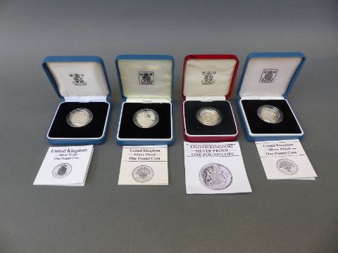 Four cased Royal Mint silver proof £1 coins comprising 1983, 1986, 1987 and 1988 with certificates