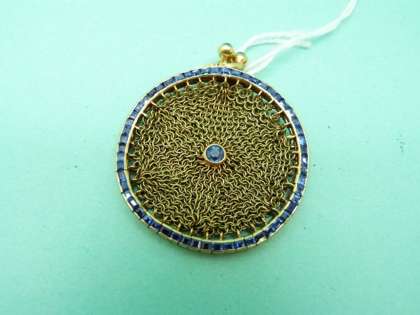 An 18ct gold coin purse set with a round cut sapphire to the centre, baguette cut sapphires to the border and sapphire cabochons to the fastening